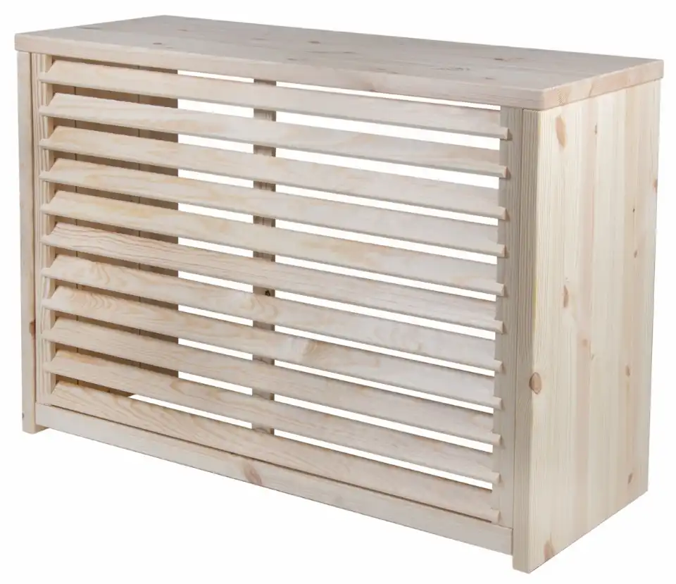 Parvekesuojuskotelo Basic FI213B on kotimaisesta männystä valmistettu suoja ilmalämpöpumpun ulkoyksikölle parvekekäyttöön. Se viimeistelee asennuksen siistiksi, suojaa laitetta säältä ja tuo luonnollista ilmettä taloyhtiön julkisivuun.
